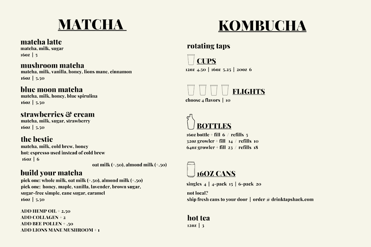 TapShack Kombucha & Coffee Menu